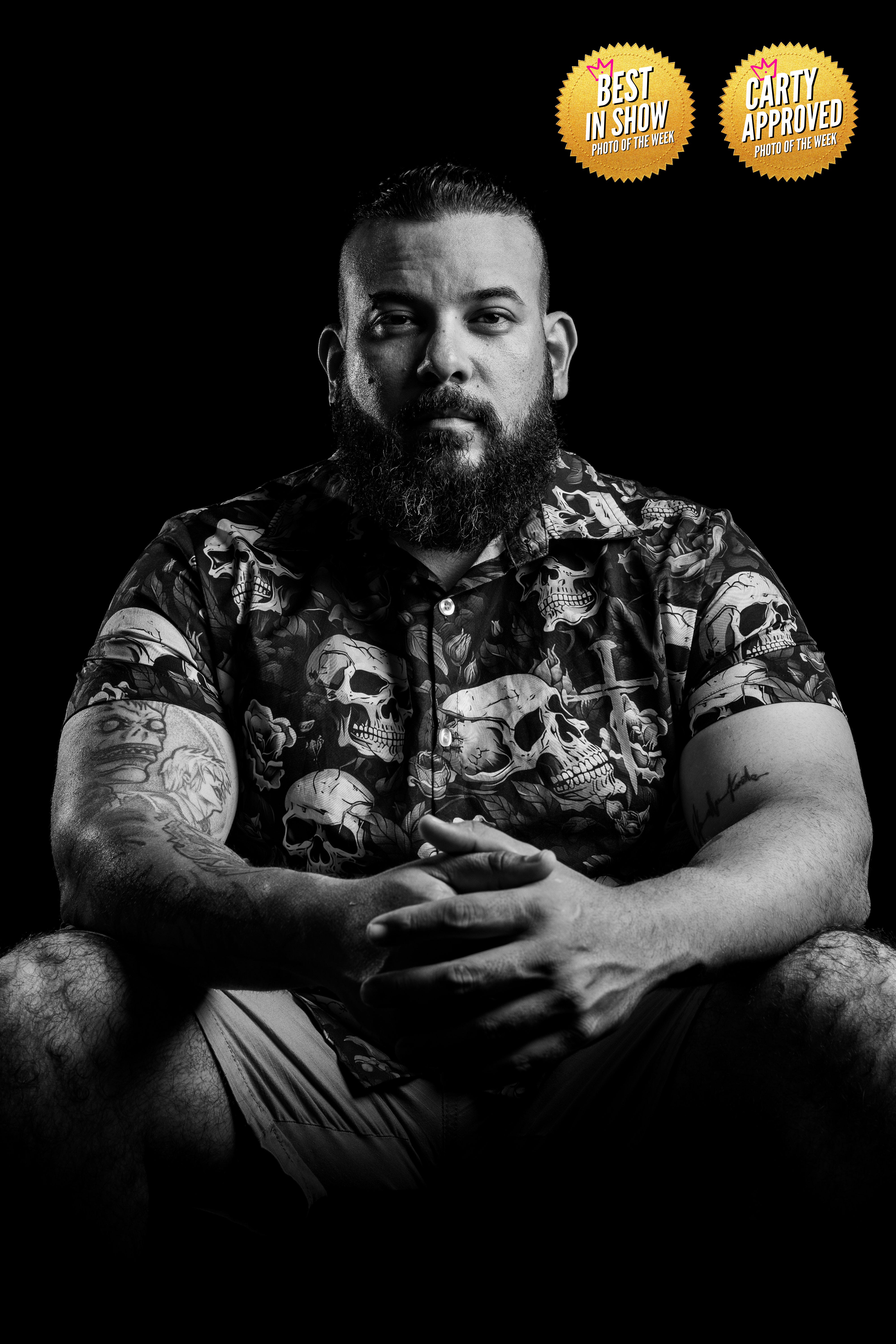 Removing colour allowed the focus to shift entirely to the subject’s expression, body language, and texture, his beard, tattoos, and posture become the visual language of the image.