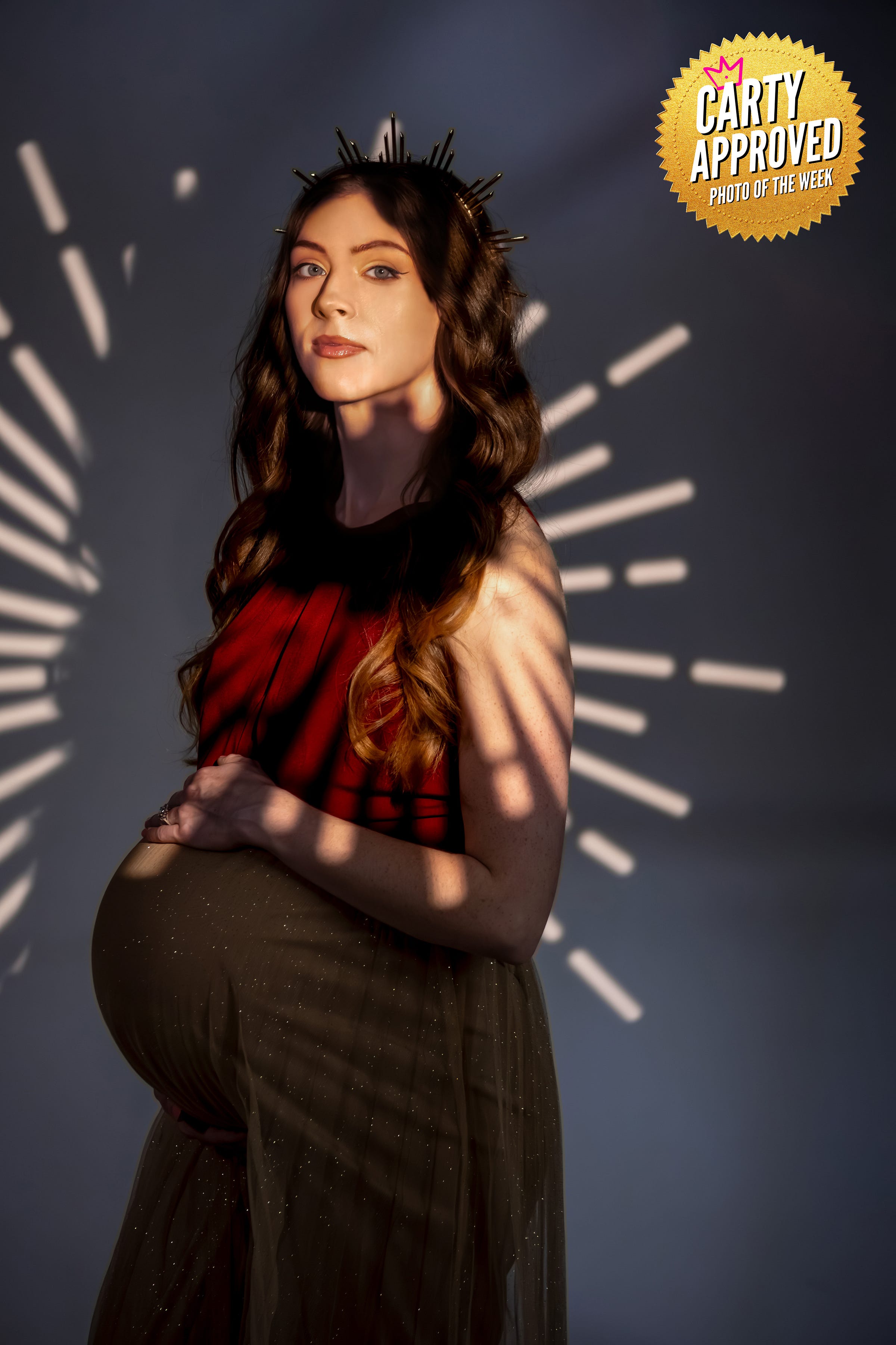 By placing a crown on her head, the photograph elevates pregnancy from a biological state to a symbol of dignity, honor and strength while emphasizing her presence as the central figure.