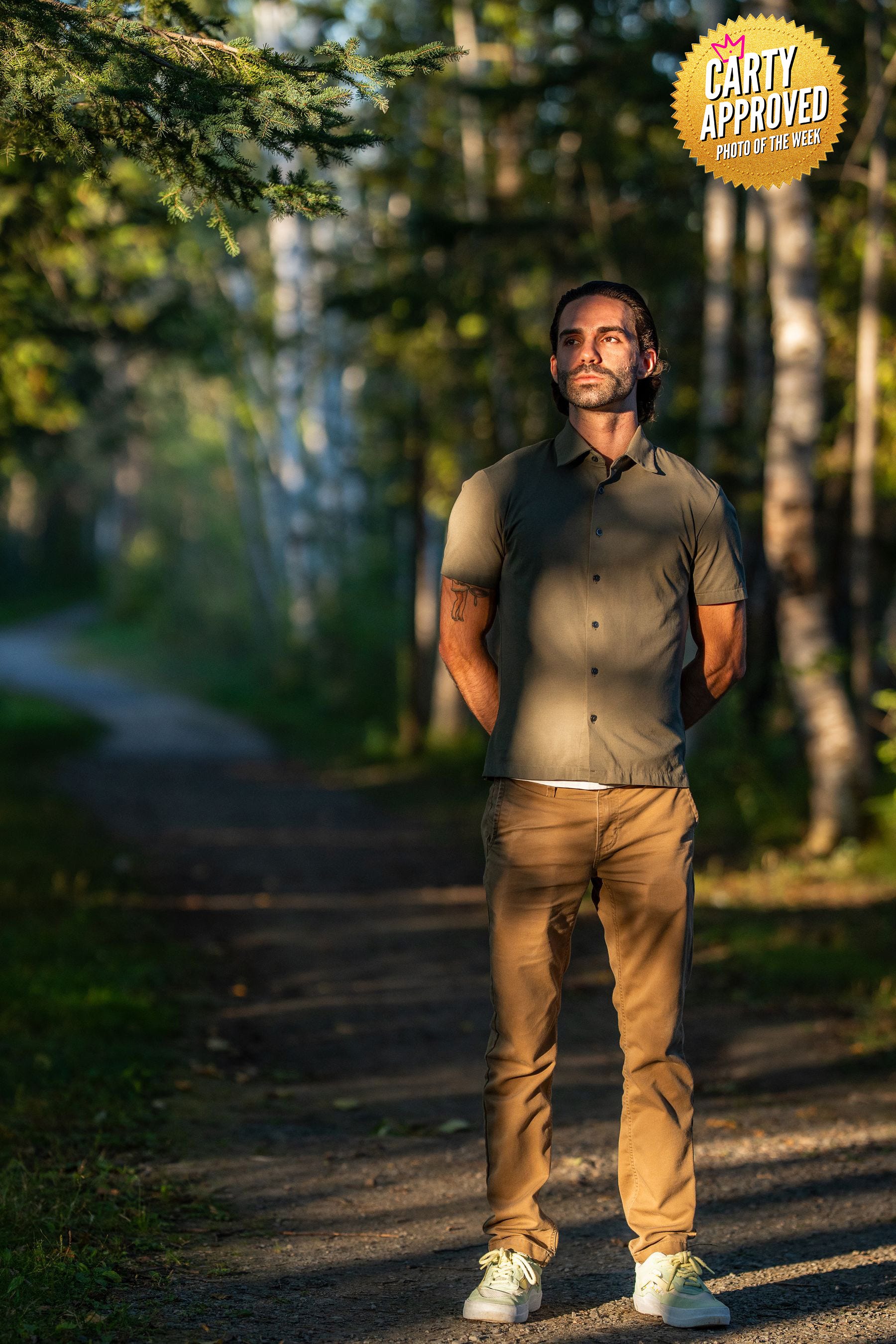 I liked the look of the light coming through the trees so I lagged back a bit and gave the subject a few minor directions to get the light to land on him the way I wanted while keeping his pose as authentic as possible.