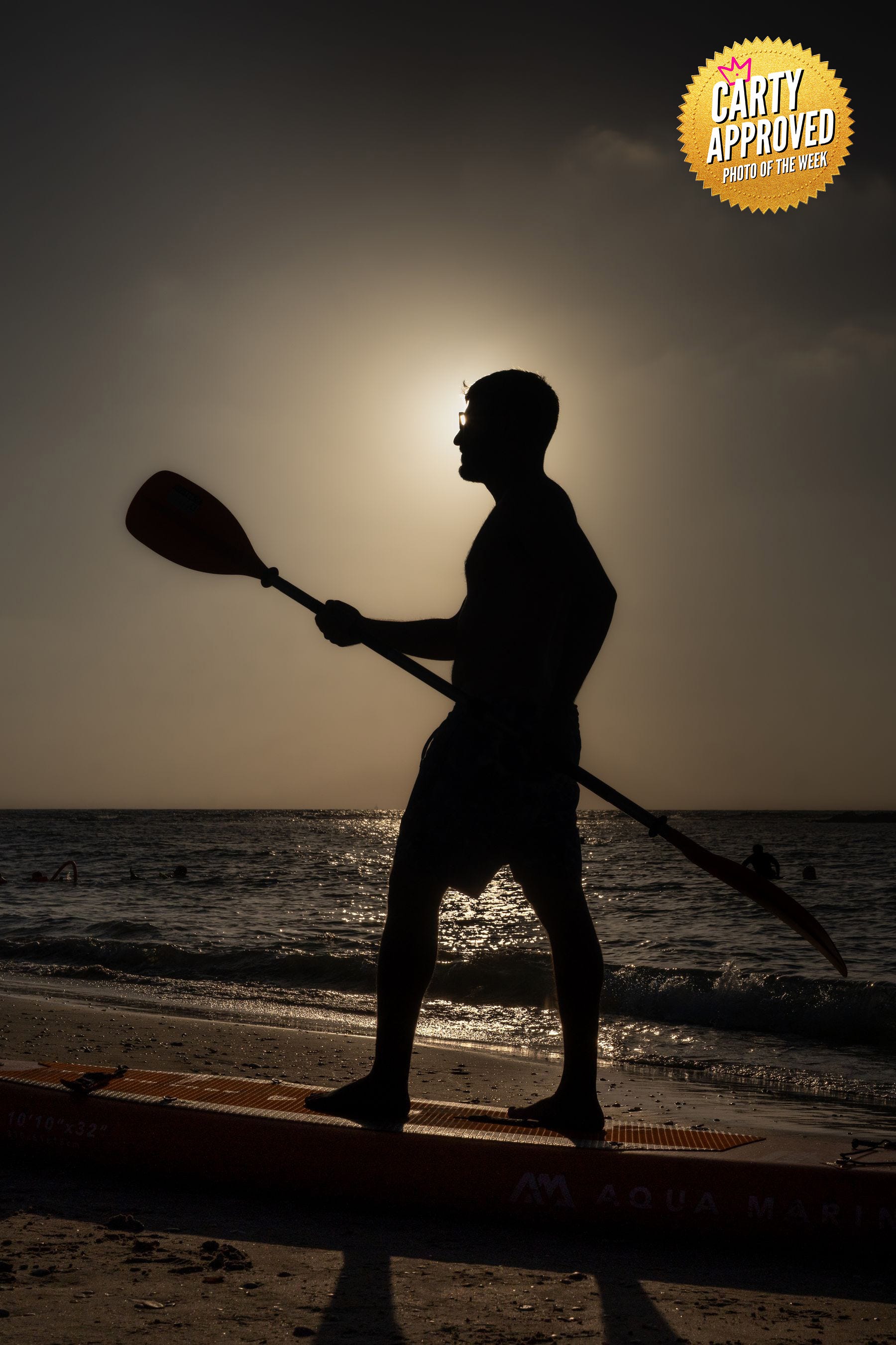 The key elements for me were the glint of sunlight through the frame of his glasses, the texture of the sand and water, and the shape of the paddle.