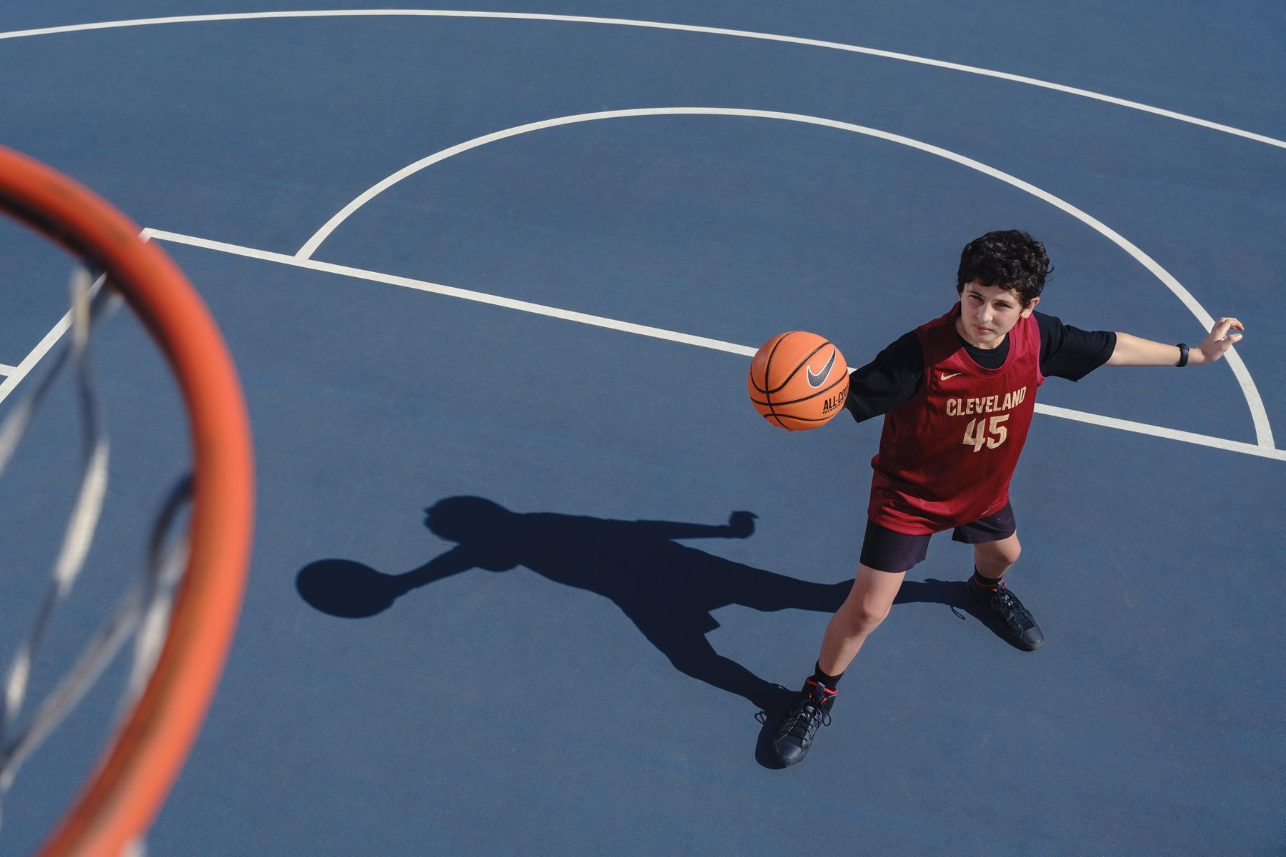 I knew I wanted the hoop in the shot, the shadow had to be open or expressive somehow, showing all of the limbs, and the format had to be suitable for a wrap-around cover, so the subject had to be on the right half of the horizontal image.